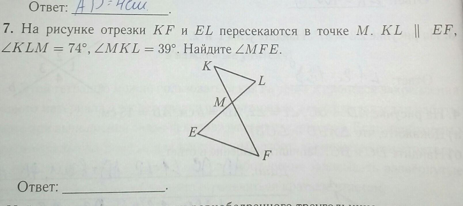 на рисунки отрезки Кф и ел пересекаются в точке м. кл параллельна еф, угл клм равен семьдесять четыре градуса, угл мкл равен тридцать девять градусов. найдите угл млф