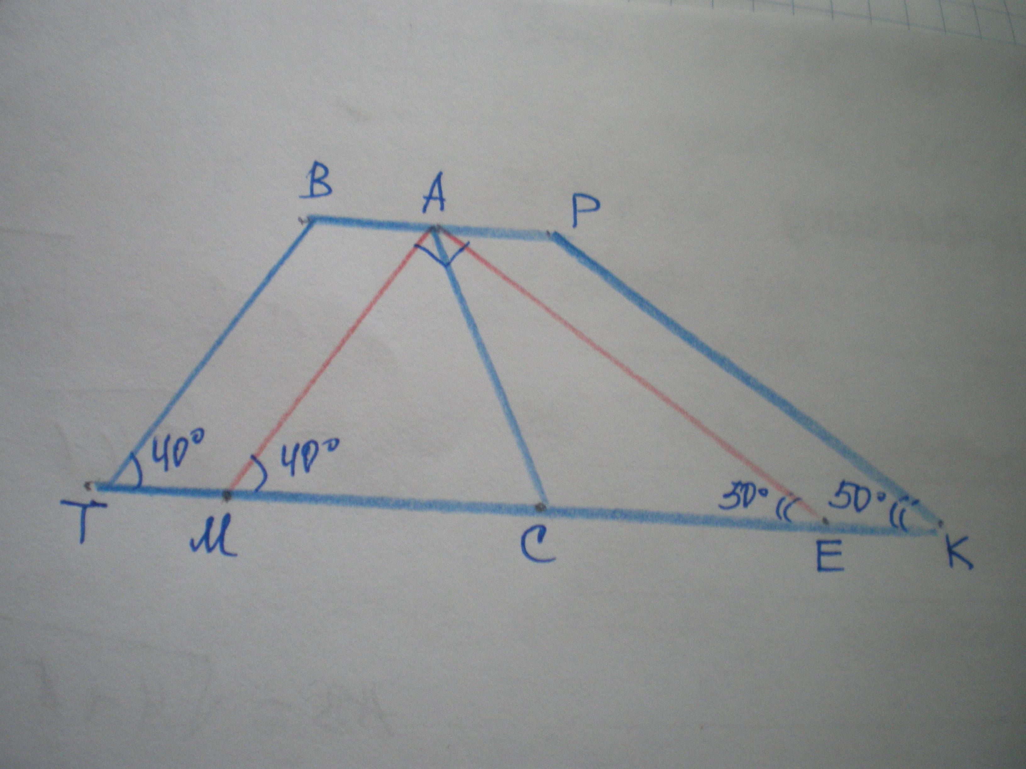 т.к. ∠ВТК+∠РКТ=40+50=90°, то и ∠АМЕ+∠АЕМ=90°