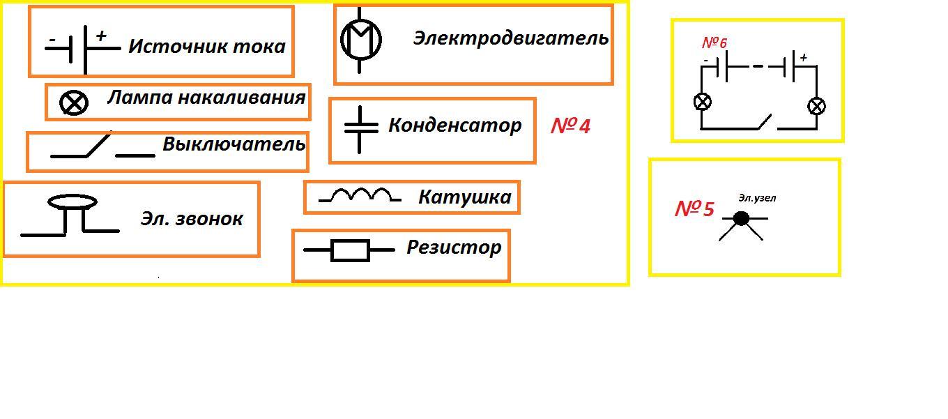 4. Как обозначаются на схеме: источник питания, лампа накаливания, выключатель, электрический звонок, электродвигатель, конденсатор, катушка индуктивности, резистор?