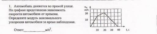 На графике представлена зависимость скорости автомобиля от времени. Определите модуль максимального ускорения автомобиля за время наблюдения