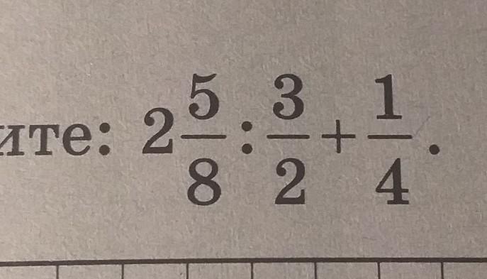 Для начала переведем 2 5/8 в неправильную дробь. После чего нам надо разделить неправильную дробь на 3/2, для этого пользуемся правилом: чтобы разделить дробь на дробь, надо перевернуть ту дробь, на которую делим и поменять знак деления на умножение. После чего нам надо сложить полученную дробь с 1/4, т.к. знаменатели одинаковые, складываем только числители, сокращаем и получаем ответ.