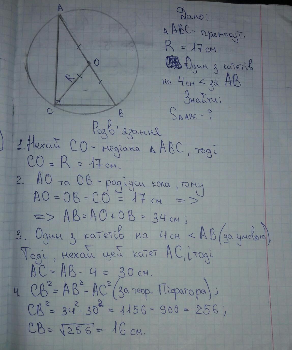 Один із катетів прямокутного трикутника на 4 см меньший від гіпотенузи, а радіус описаного навколо нього коло дорівнює 17 см. Обчісліть площу даного трикутника