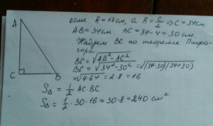 Один із катетів прямокутного трикутника на 4 см меньший від гіпотенузи, а радіус описаного навколо нього коло дорівнює 17 см. Обчісліть площу даного трикутника
