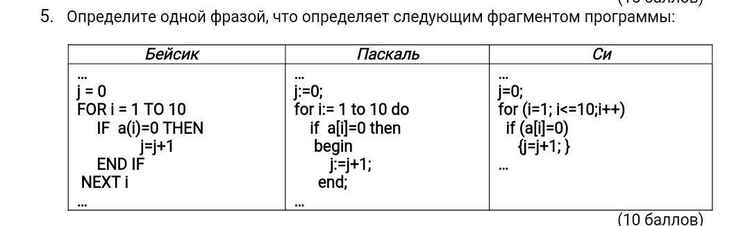В теле цикла, который проходит 10 раз стоит условие: если на i проходе a[i] = 0, то итерируем(увеличиваем на один) переменную j. Таким образом, если представим массив условный a[0,1,2,9,0,3,4,0,4,0], то j на выходе будет равна 4