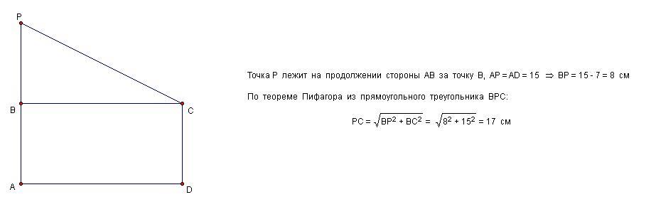 Точка P є образом вершини D прямокутника ABCD при повороті навколо точки A на куті 90° проти годиникової стоілки. Знайдіть відрізок PC якщо AB =7 см BC =15 см