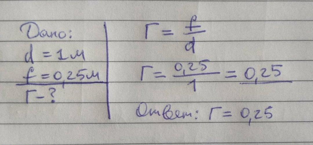 Объяснение: Расстояние от объекта до линзы отмечается буквой (d), расстояние от линзы до проекции букой (f), далее воспользуемся формулой вычисления степени увеличения линзы: Г=f/d.