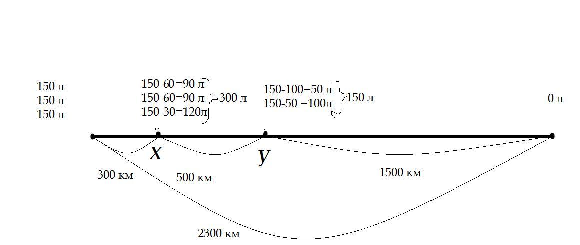 Примечание: автомобилист не обязательно отъезжает сразу на расстояние Х или У, он может перемещаться по нескольку метров. Но, в целом, он сделает три поездки вперед и две назад, пока не израсходует 150 л, потом необходимость возвращаться исчезнет, так как часть за которой возвращались, израсходована.