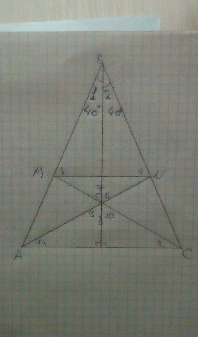 В равнобедренном треугольнике проведены высоты и известен угол В. Он равен 80 градусов. Объяснение писать не надо, только градусные меры углов, которые обозначены цифрами. Огромное спасибо кто поможет!