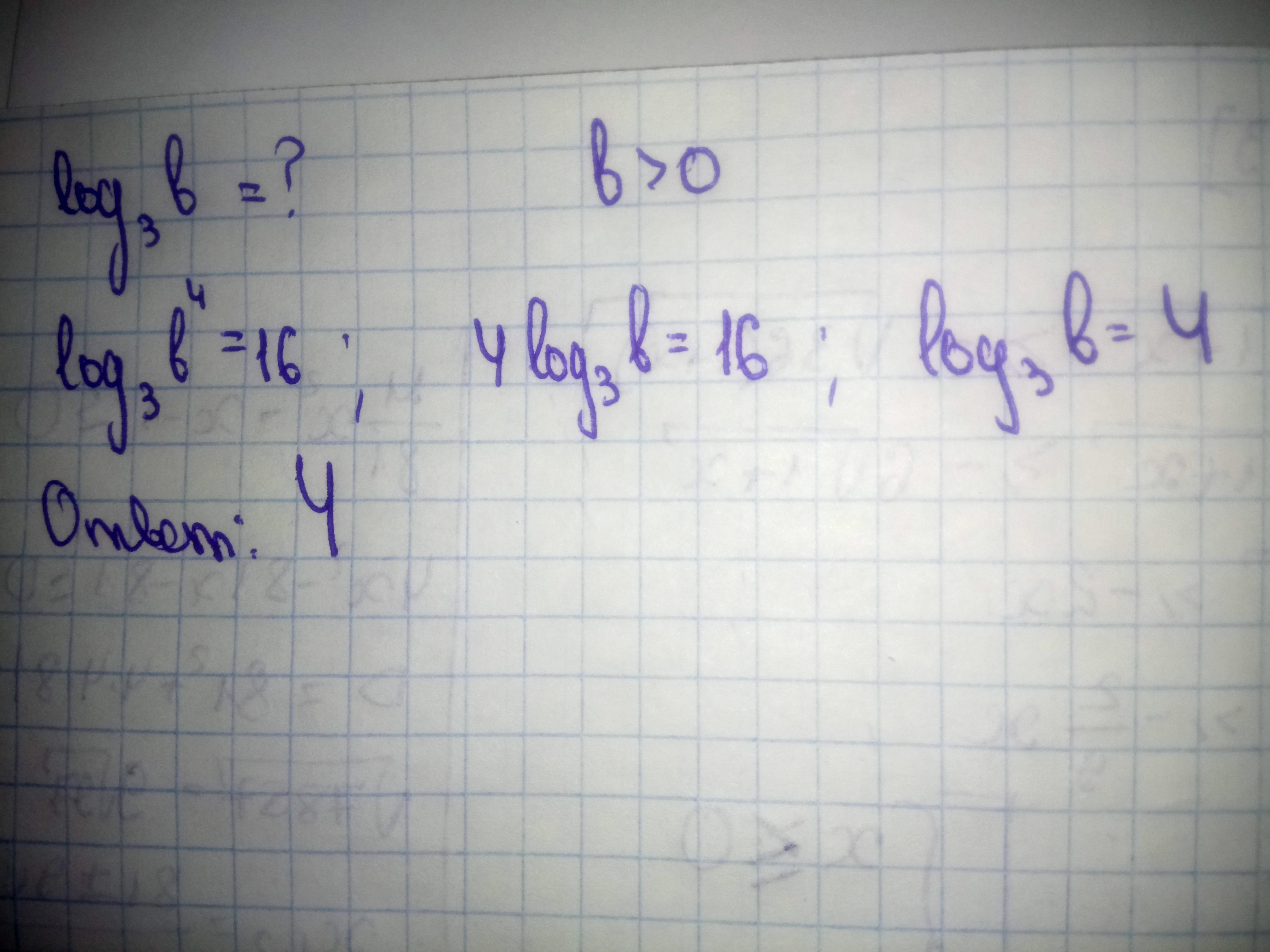 Ответ: по свойству логарифма 3^16=b^4, при этом b>0, отсюда b=3^(16/4)=3^4=81. Отсюда log₃ 81=3^(4), или log₃ b=4.