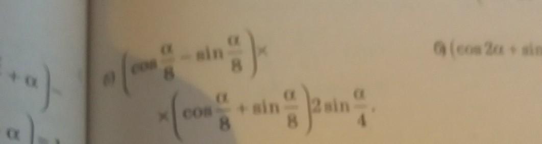 [tex]( \cos( \frac{ \alpha }{8} ) - \sin( \frac{ \alpha }{8} ) ) \times ( \cos( \frac{ \alpha }{8} ) + \sin( \frac{ \alpha }{8} ) ) \times 2 \sin( \frac{ \alpha }{4} ) \\ \\