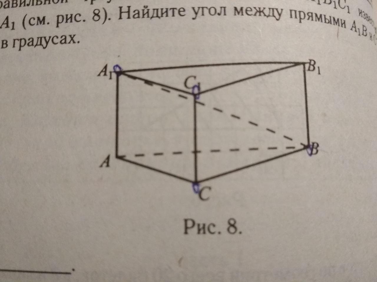 В правильной треугольной призме abca1b1c1 известно, что ab=aa1. Найдите угол между прямыми a1b и c1c. Ответ дайте в градусах.