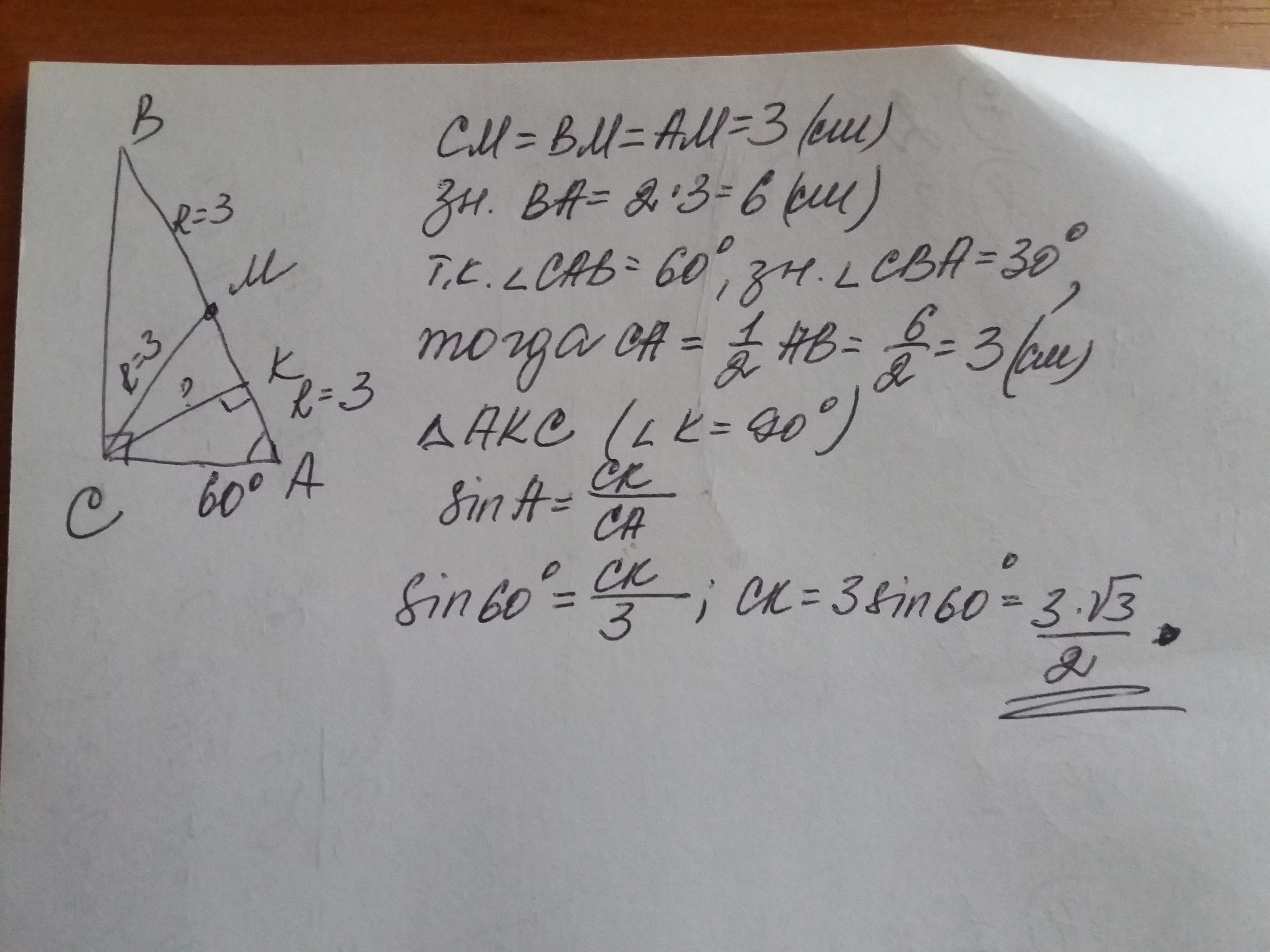 Есть решение в одну строчку, по первому рисунку: cos(MCK) = CK/CM откуда CK = CM * cos30градусов получится 3*sqrt(3)/2