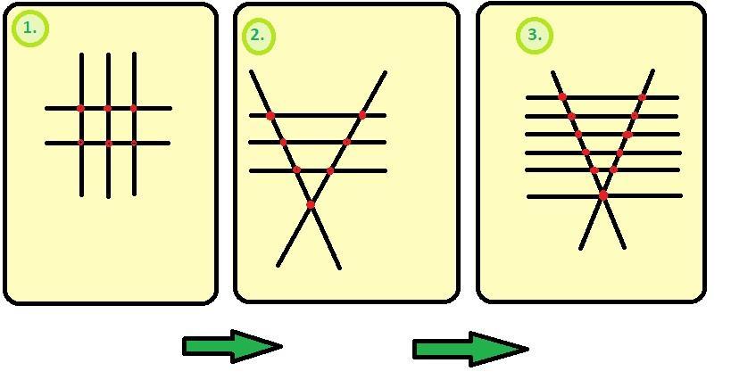 2) 3 параллельных прямых пересекаются двумя другими, пересекающимися в точке, не касающейся трёх параллельных - имеем 5 прямых и 7 точек пересечения.