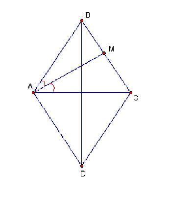 В ромбі ABCD бісектриса кута BAC перетинає сторону BC в точці М. Знайти кути ромба, якщо ∠AMC = 120°