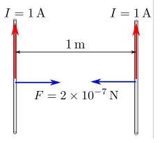 "Ампер - сила неизменяющегося тока, который при прохождении по двум параллельным прямолинейным проводникам бесконечной длины и ничтожно малой площади кругового поперечного сечения, расположенным в вакууме на расстоянии 1 метр один от другого, вызвал бы на каждом участке проводника длиной 1 метр силу взаимодействия, равную 2⋅10⁻⁷ ньютона"