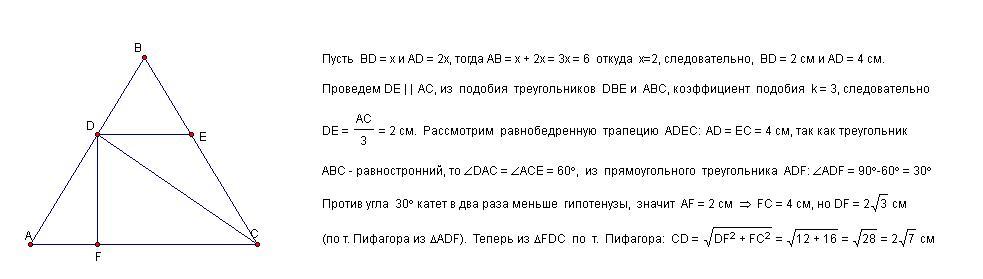 На стороне АВ равностороннего треугольника АВС обозначено D так , до AD : DB = 2 : 1 Найти отрезок CD чудо АВ = 6 см