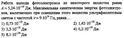 h*v=A+Ek Ek=h*v-A=6,62*10^-34*9*10^14-5,24*10^-19=0,73*10^-19 Дж