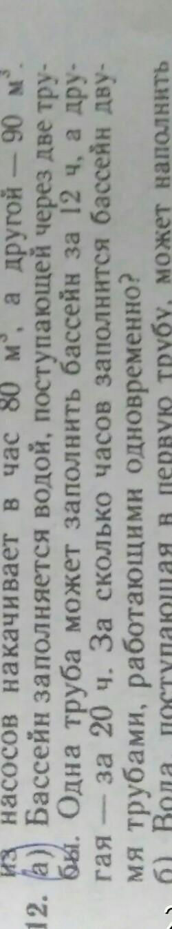 Первая труба может заполнить бассейн за 12 часов, значит за час она выполняет 1/12 часть работы. Вторая труба может заполнить бассейн за 20 часов, значит за час она выполняет 1/20 часть работы .