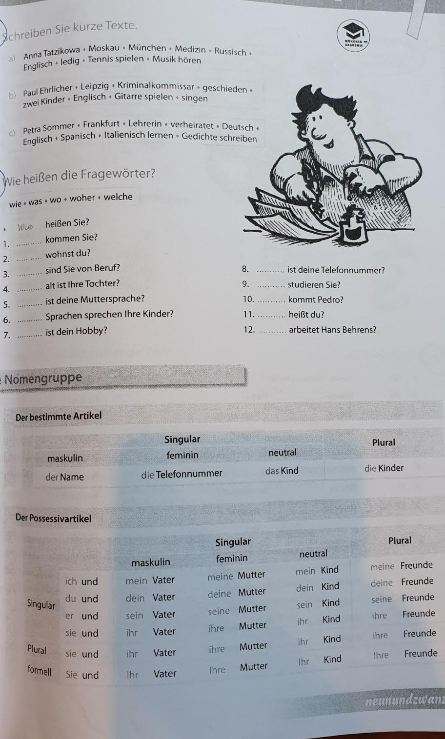 a) Anna Tatzikowa kommt aus Moskau. Sie wohnt in München. Anna arbeitet in der Apotheke und verkauft Medizin. Sie spricht Russisch und Englisch. Ihr Hobbys sind Tennis spielen und Musik hören.