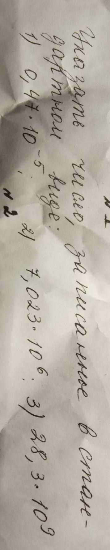 Очень большие или очень маленькие числа принято записывать в виде: a*10ⁿ. Эта запись называется стандартным видом. Здесь n должно быть целым (все приведенные в задании числа соответствуют данному критерию), а число а: 1≤а<10. Под этот критерий подходит только одно число - второе: