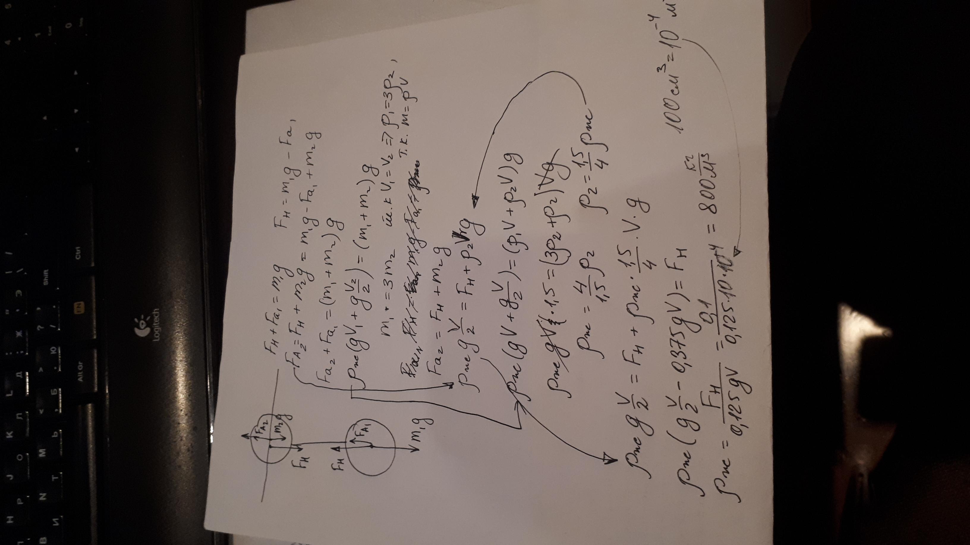 два шара одинакового объема 100 см3 связаны нитью и погружены в жидкость. верхний шарик плавает, наполовину погружаясь в жидкость. найдите ее плотность, если известно, что сила натяжения нити составляет 0,1 Н, а нижний шар в 3 раза массивнее верхнего. g = 10 м/с2.