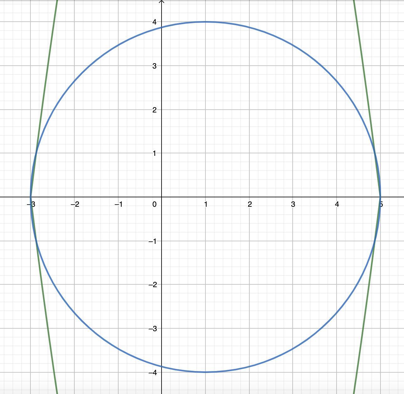В случае, когда реализуется 6 решений, окружность проходит через точку (5; 0). Её центр расположен в точке (1; 0). Значит, радиус равен 4: