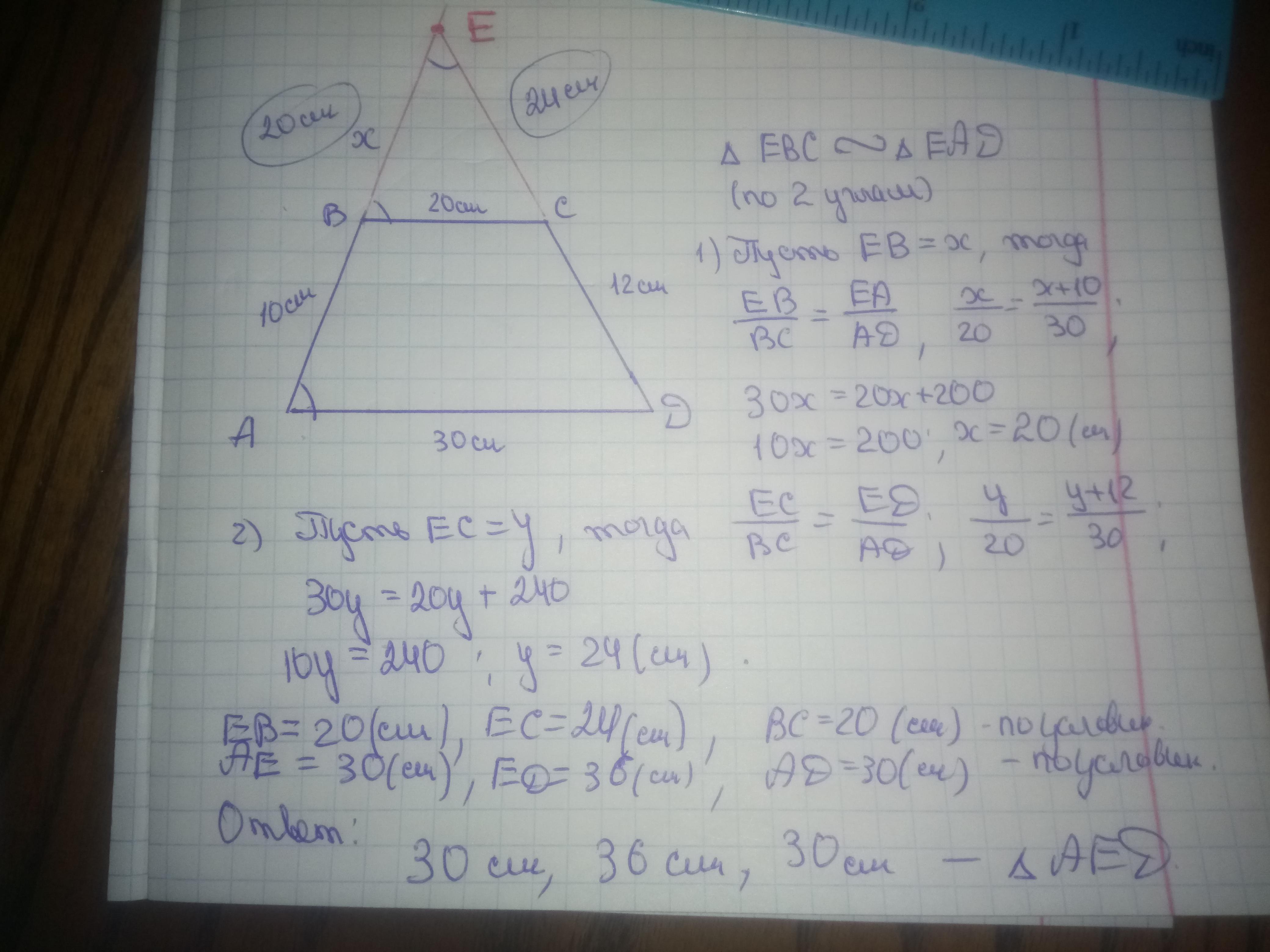 ,Несущие прямой Боковые стороны AB и CD трапеции ABCD пересекаются в точке е Найдите длину сторон треугольника aеd если AB равно 10 см BC 20 см сд=12 см и ад=30 см