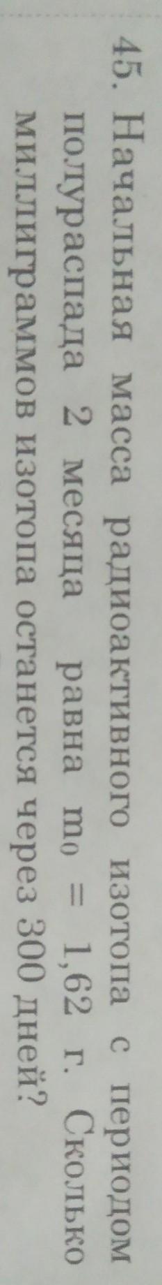 Начальная масса радиоактивного изотопа с периодом полураспада 2 месяца равна m0=1,62 г. Сколько миллиграммов изотопа останется через 300 дней?