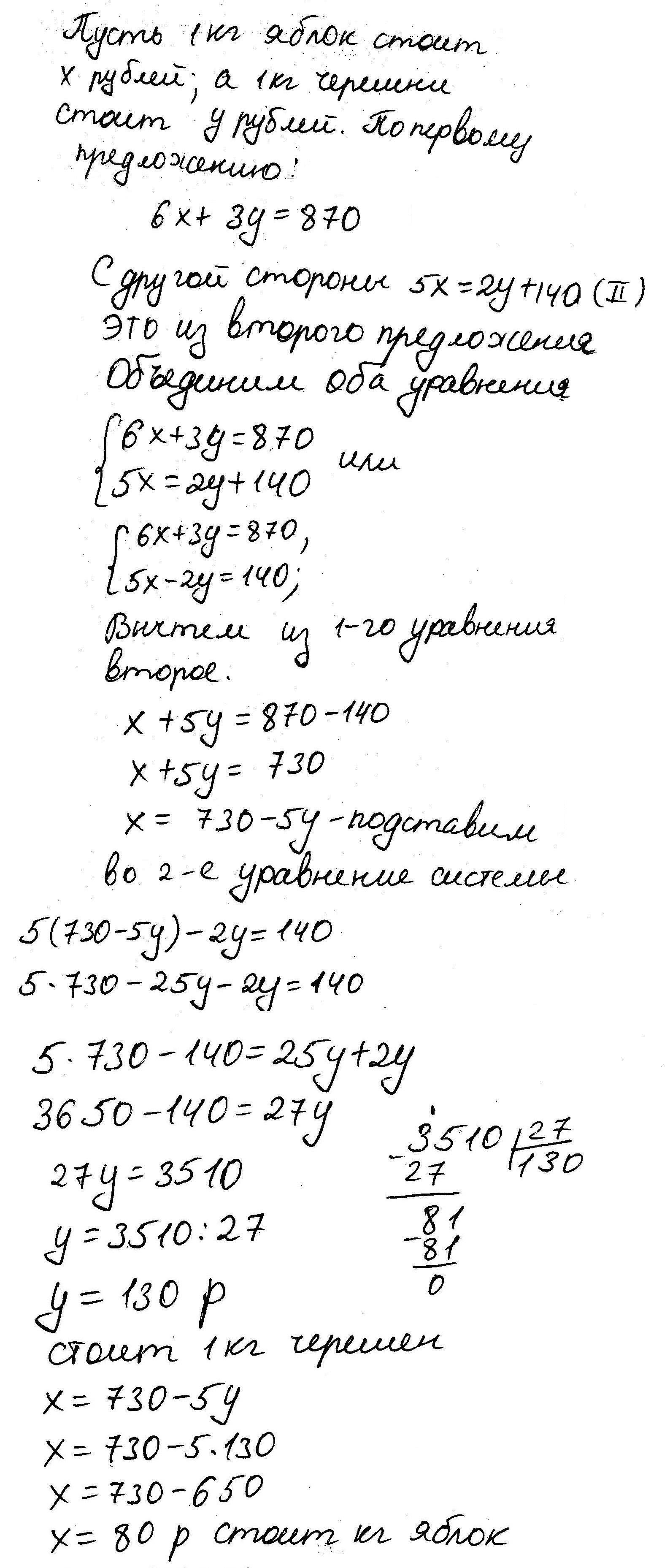 за 6кг яблок и 3кг черешни заплатили 870р. сколько стоит 1 кг яблок и сколько стоит 1 кг черешни, если 5кг дороже чем 2кг черешни на 140р