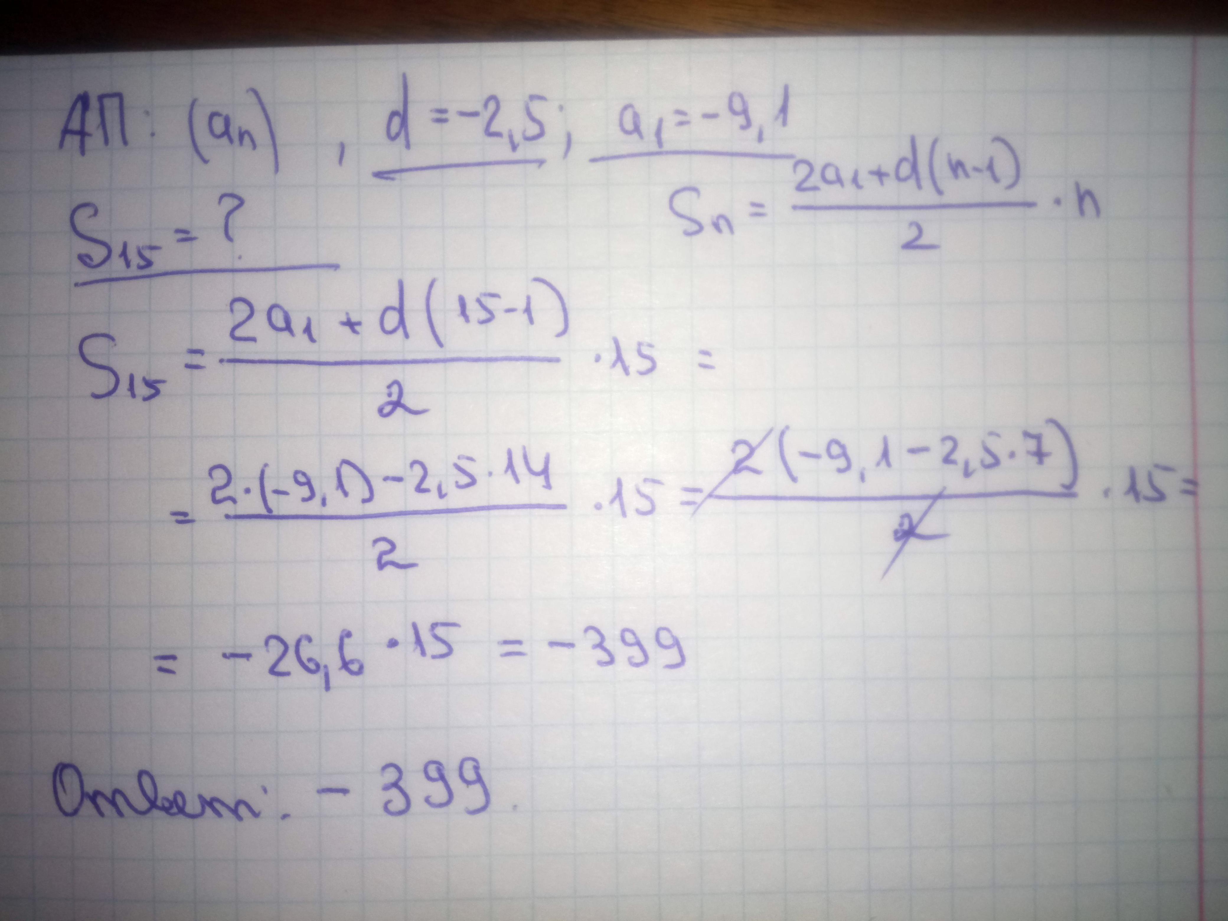 Дана арифметическая прогрессия (an), разность которой равна −2,5, a1 = −9,1. Найдите сумму первых 15 её членов.