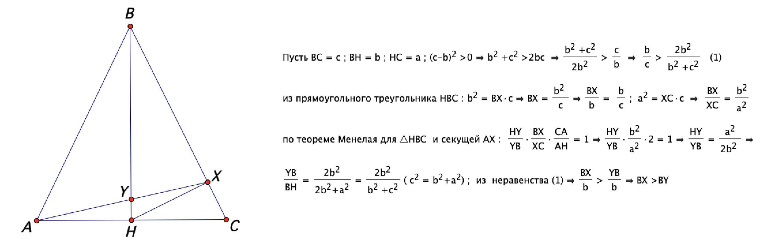 в треугольнике ABC AB=BC,ВН-высота,HХ-высота в треугольнике ВСН.Отрезок АХ пересекает ВН в точке Y. Что длиннее--ВХ или ВY