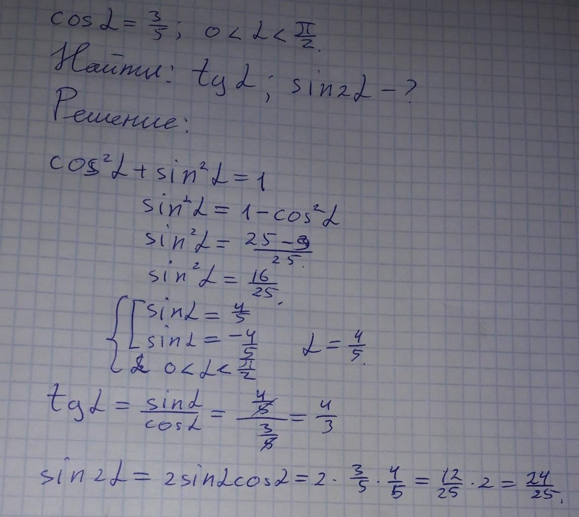 8. Известно, что cos a = 3/5, a - угол первой четверти. Найти tg a, sin 2a.