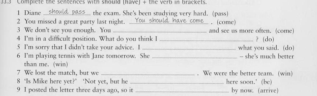 5 I should have done what you said. 6 She should win. 7 We should have won. 8.... he should be here soon. 9.... so it should arrive by now.