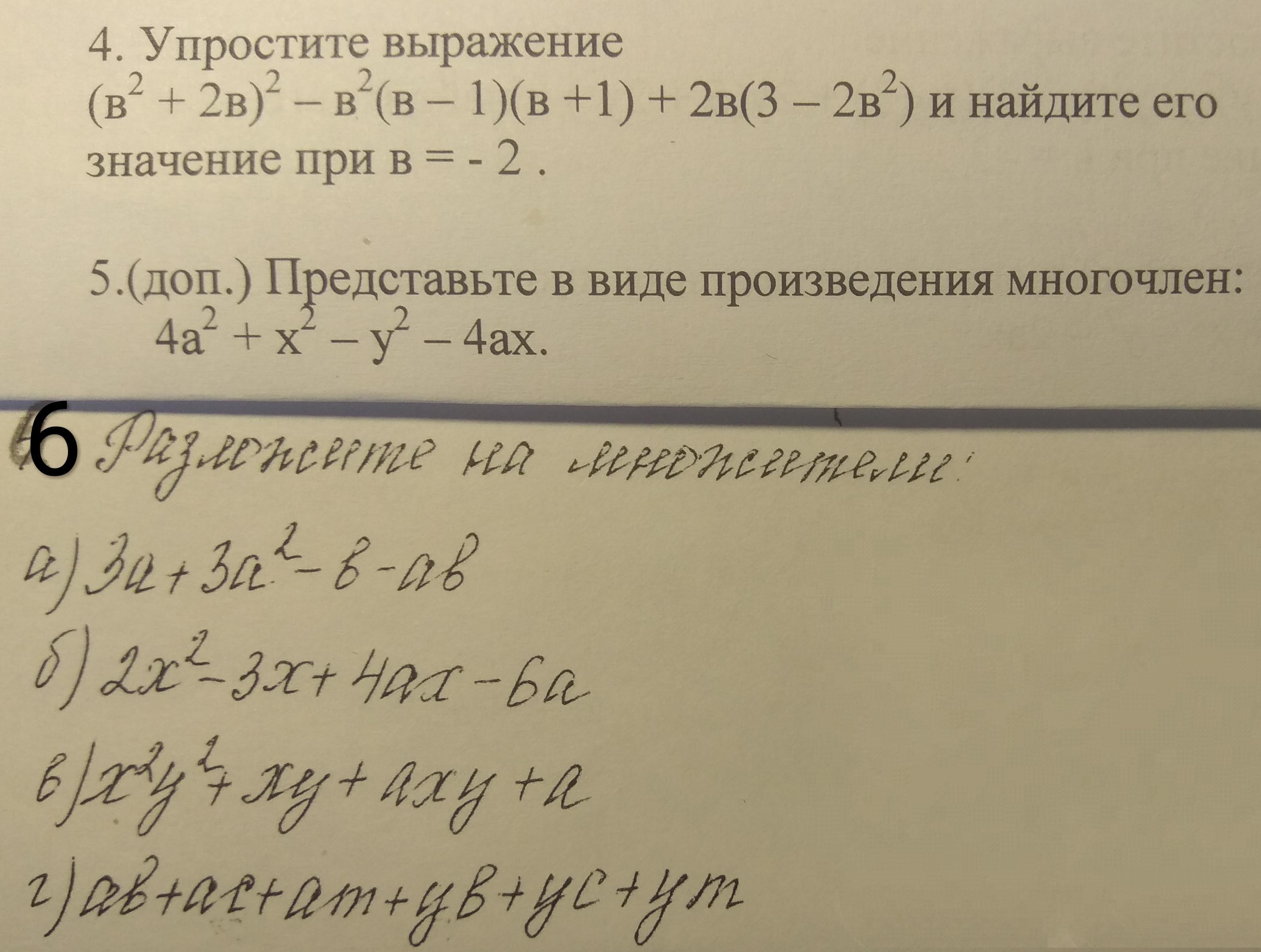 №6. а) = (3а + 3а²) - (в + ав) = 3а(1 + а) - в(1 + а) = (1 + а)(3а - В)