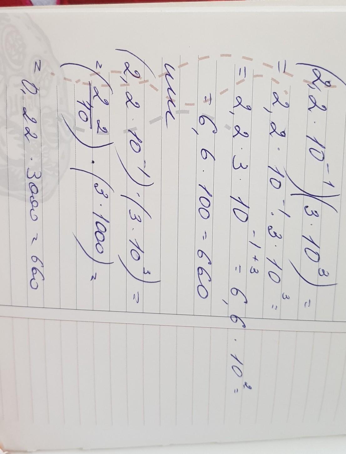 (2,2*10^(-1))*(3*10^3)=(2,2*3)*(10^(-1) *10^3)=6,6*10^(-1+3)=6,6*10^2=6,6*100=660