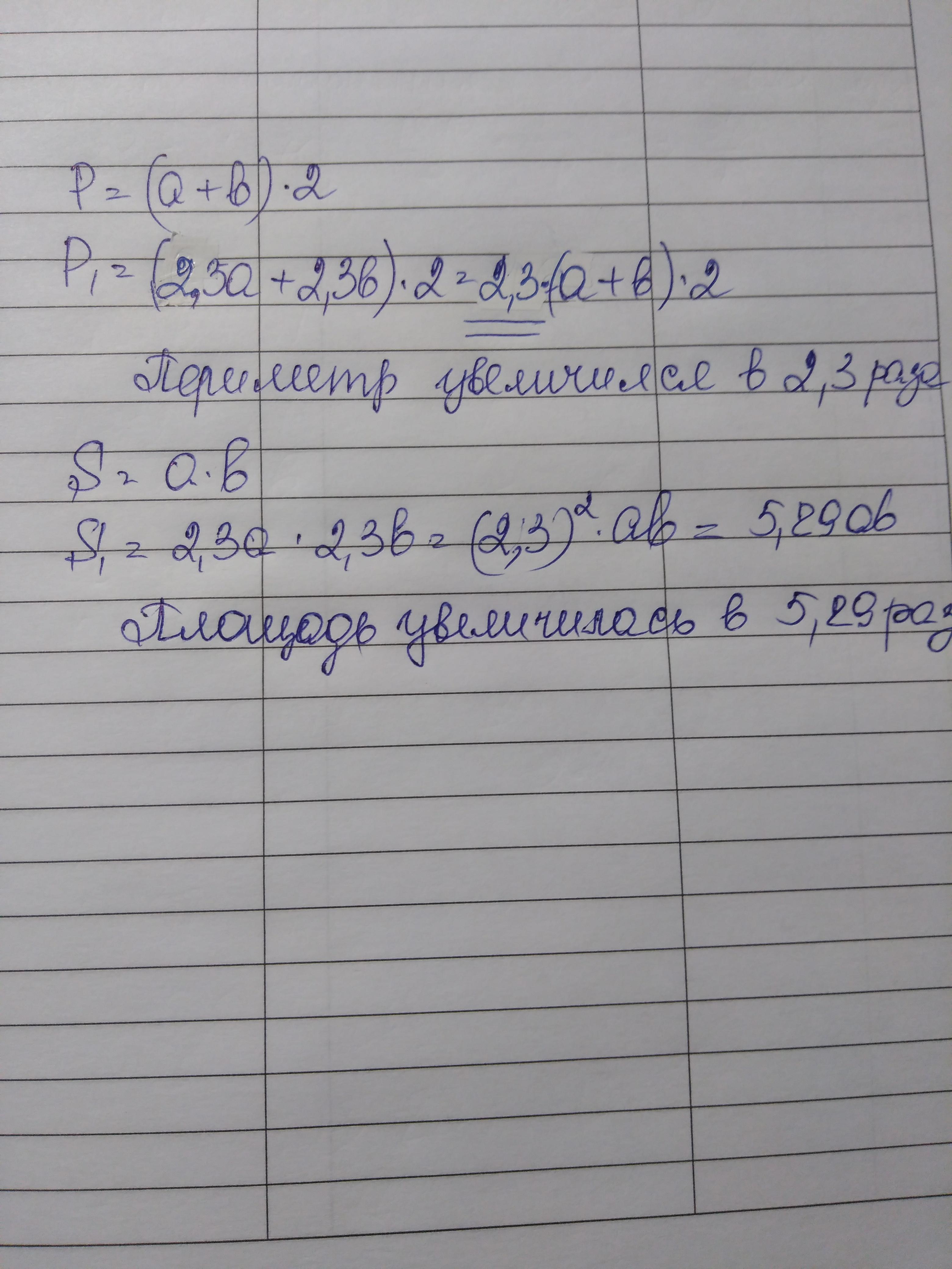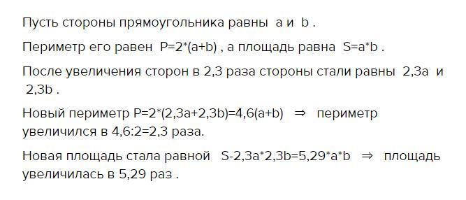 Во сколько раз увеличится периметр и во сколько раз увеличится площадь прямоугольника если каждую его сторону увеличить в 2,3 раза