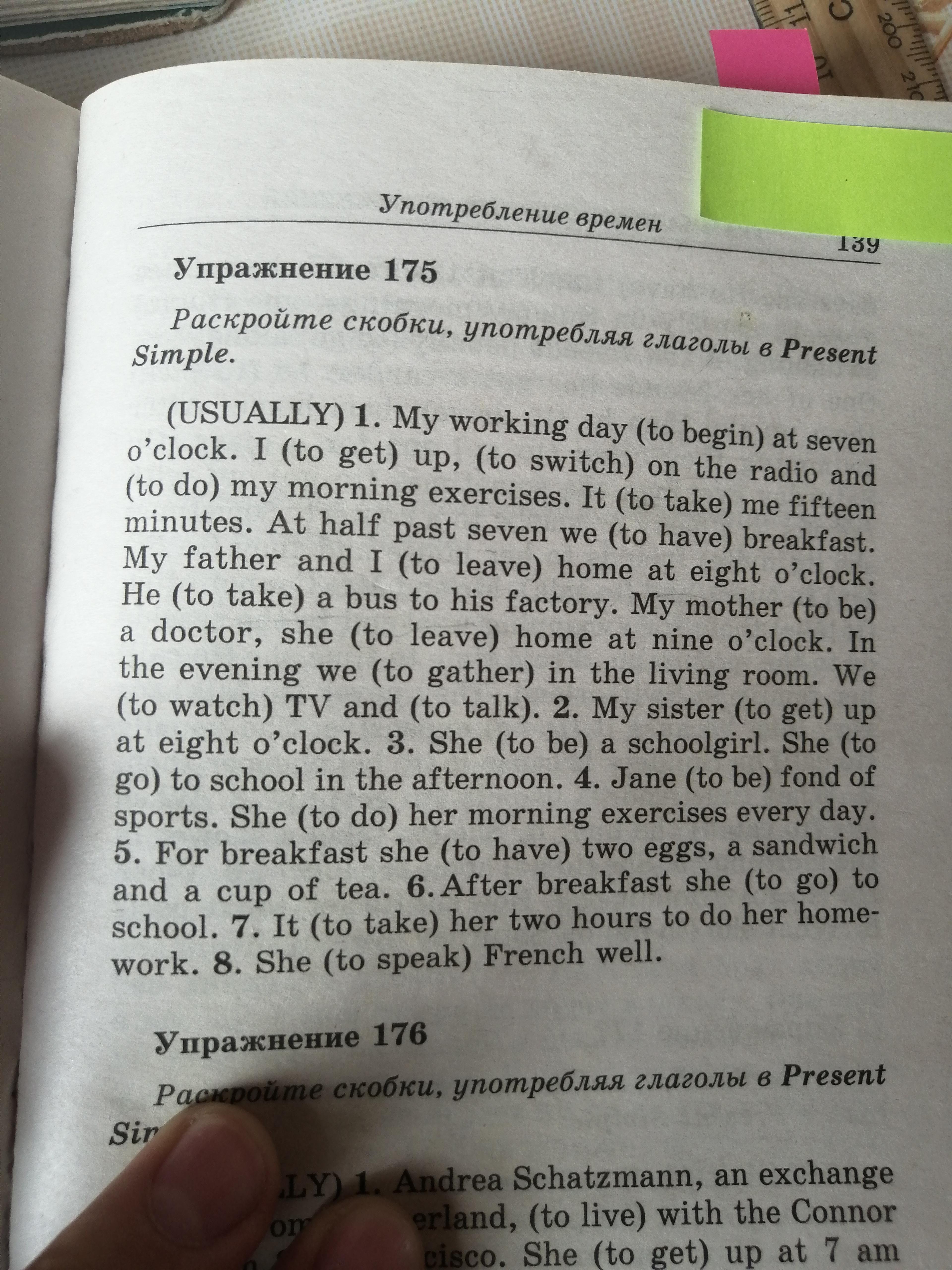 1-usually begins/get up/switch on/do/takes/have/leave/takes /is/leaves/gather/watch/talk