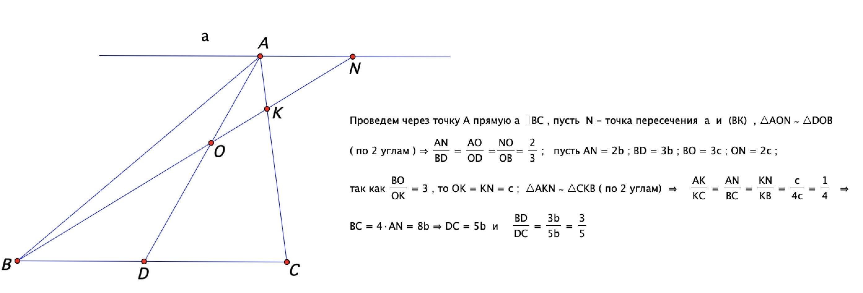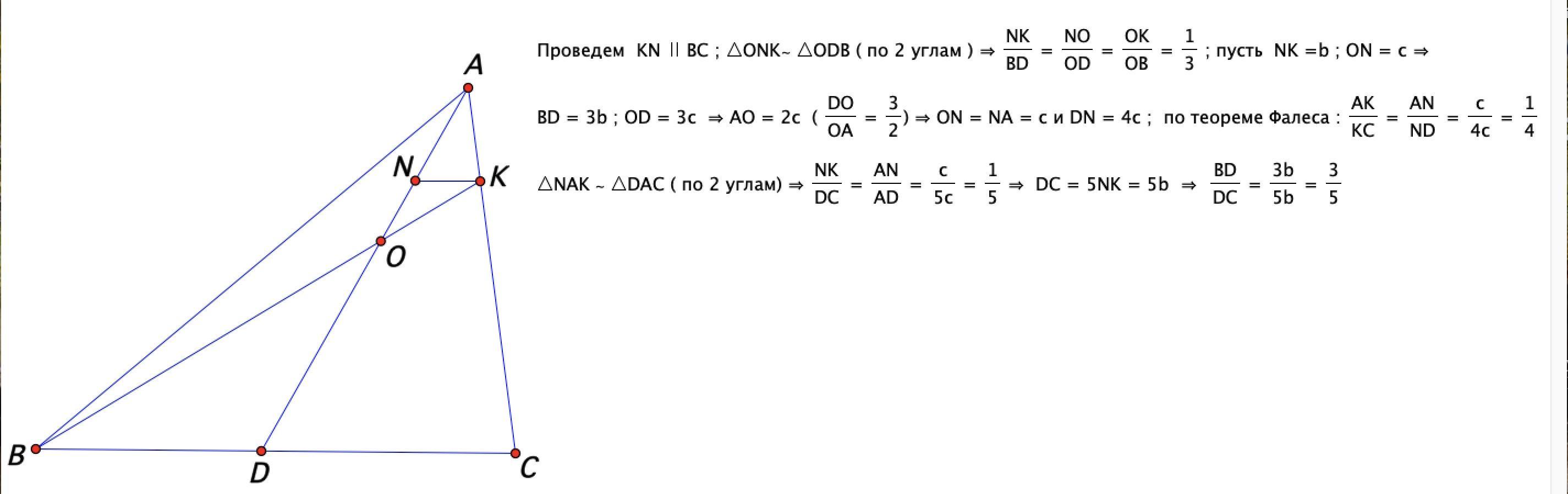 AK/KC = 2/1 и BD/DC = 9/2 у меня так