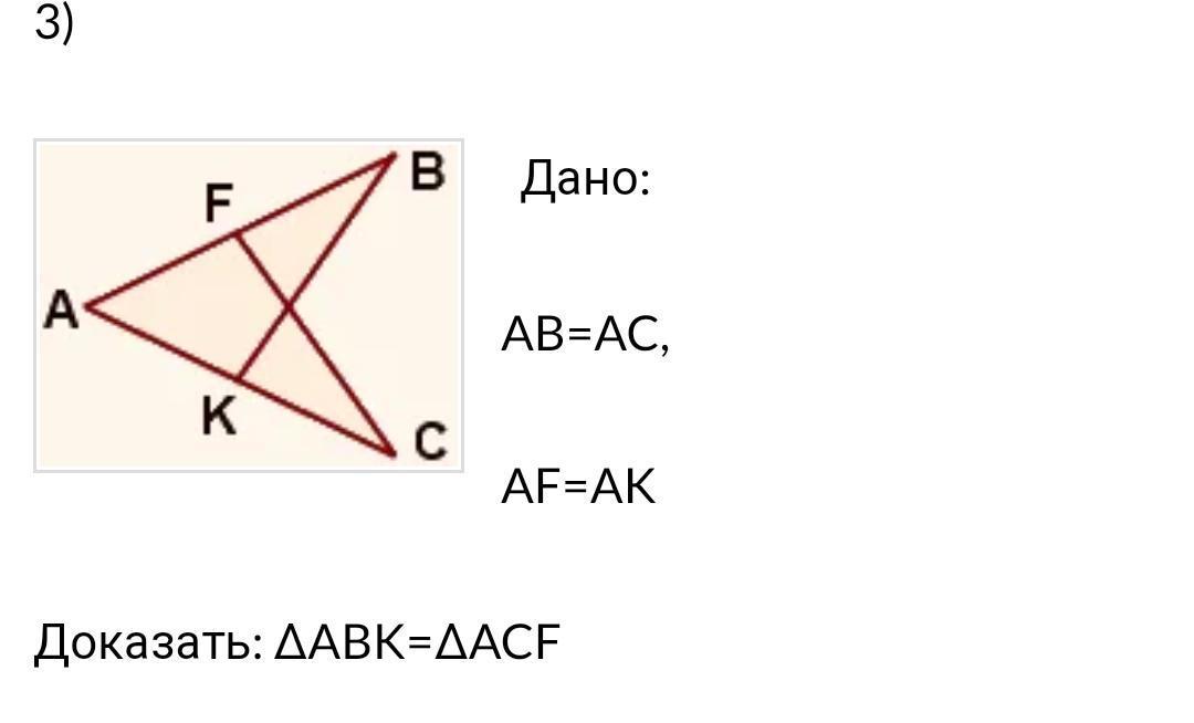 Док-во: треуг. АВК = треуг. ACF т.к. АВ=АС, AF=AK, угол А - общий (первый признак равенства треугольников).