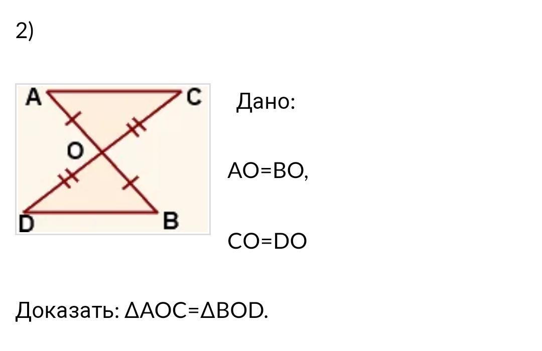Док-во: треугольник AOC = треуг. BOD т.к. АО=ВО, СО=DO, угол АОС = углу DOB (т.к. они вертикальные) (первый признак равенства треугольников).