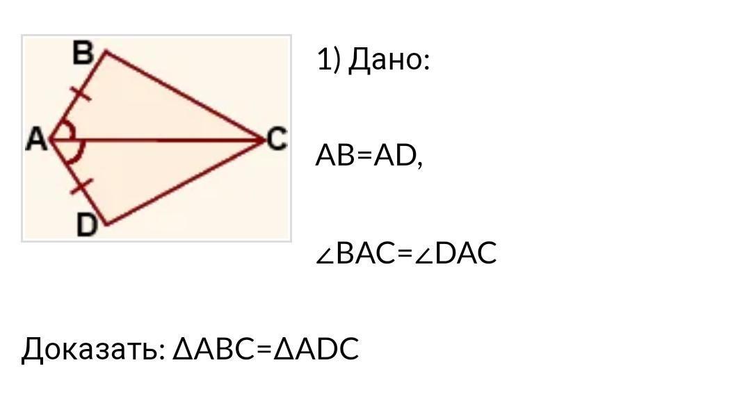 (Если две стороны и угол между ними одного треугольника равны соответственно двум сторонам и углу между ними другого треугольника, то такие треугольники равны.)