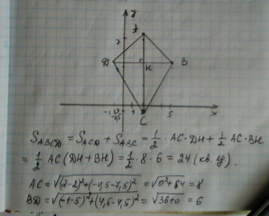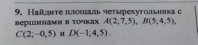 Найдите площадь четырехугольника с вершинами в точках A(2;7,5), B(5;4,5), C(2;0,5) и D(-1;4,5).