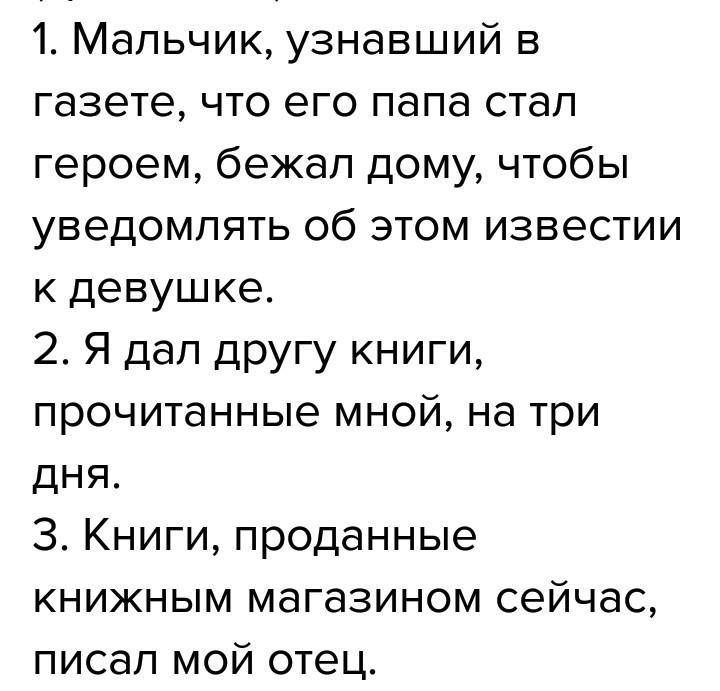 мальчик узнавший в газете что его папа стал героем, бежа к дому чтобы уведомит девушку об этом известии. 2.я дал прочитанные мной книги другу,на три дня.3.мой отец писал книги, проданные книжным магазином. 4... 5.работник приносивший красные яблоки дал ребятам выполнять план.