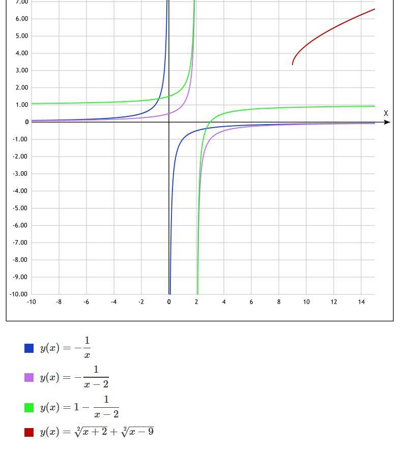справа (x-9)/(x+2)=1-11/(x-2)-это гипербола, которая расположена во второй и четвертой координатной четверти (учитывая знак "-") и сдвинутая на 1 деление вверх по оси у и на 2 деления вправо