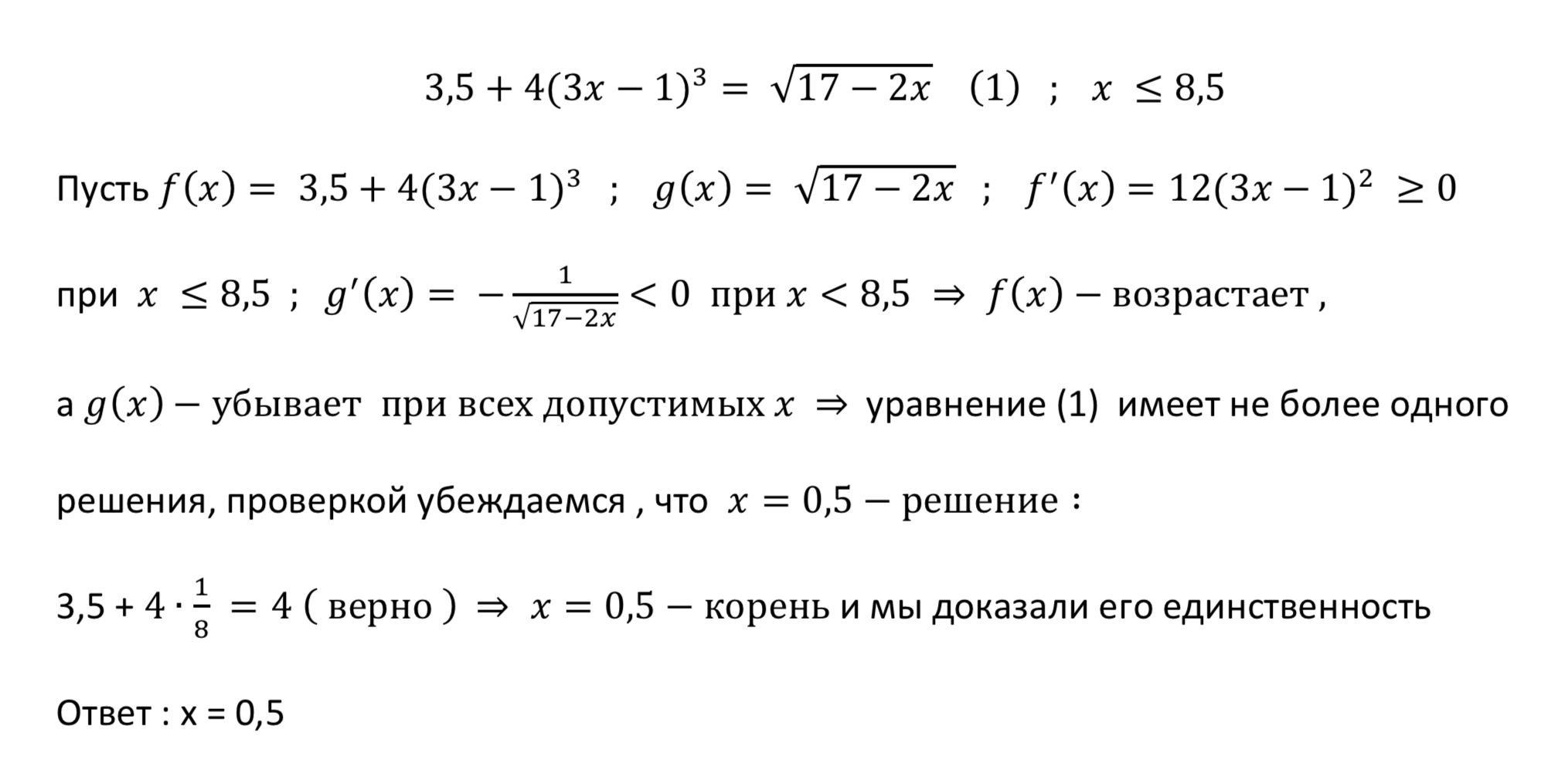 возрастание левой части уравнения можно доказать и без производной : первое ее слагаемое - константа , а второе - сложная функция , составленная из 2 возрастающих функций ( и следовательно возрастает ) , а правая часть убывает как сложная функция , составленная из 2 функций с разной монотонностью