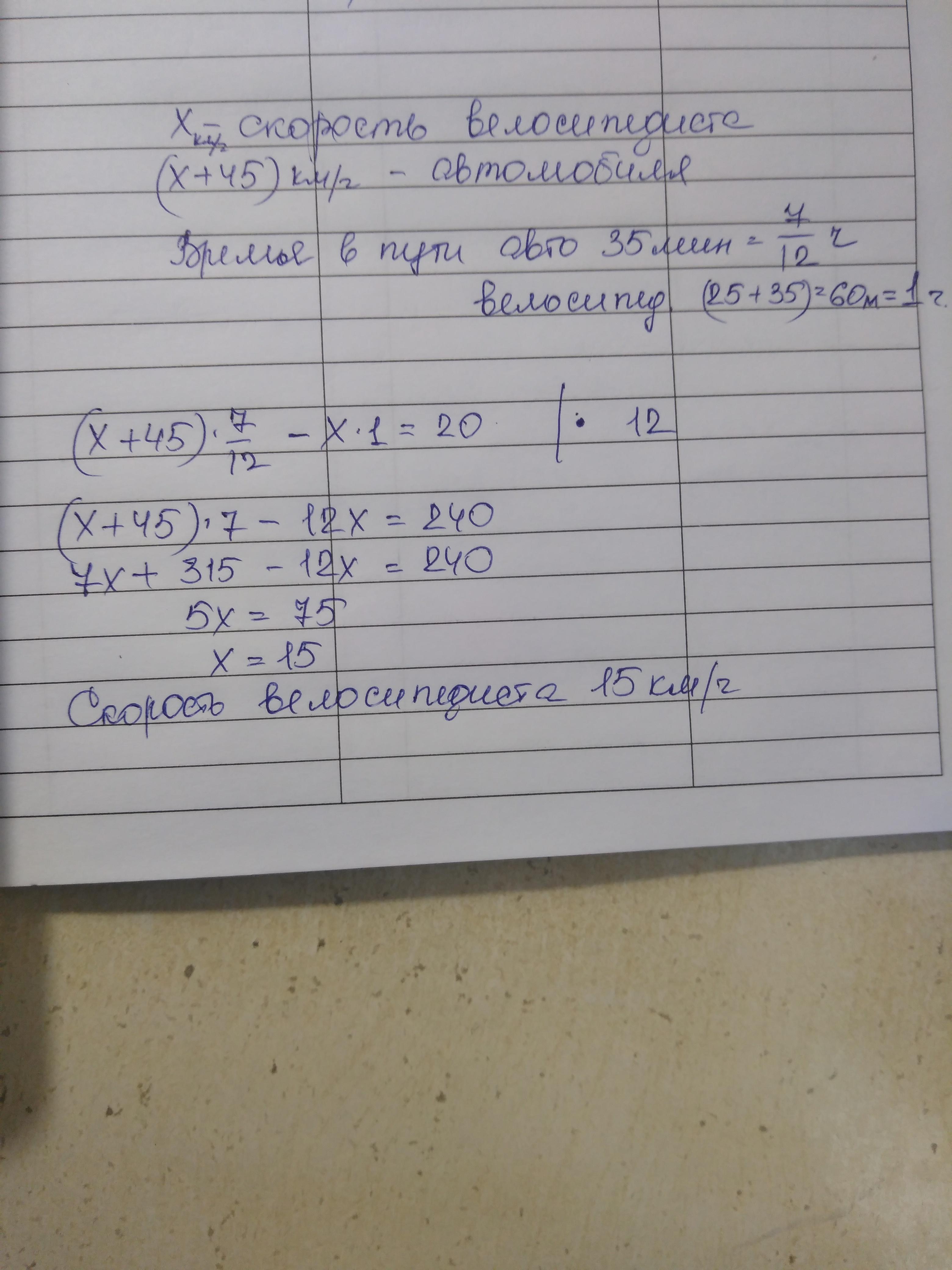 Из пункта А в пункт В выехал велосипедист. Спустя 25 мин вслед за ним выехал автомобиль, скорость которого на 45 км/ч больше скорости велосипедиста. Через 35 мин после своего выезда, автомобильобогнав велосипедиста, находился от него на расстоянии 20 км. Найдите скорость авто.