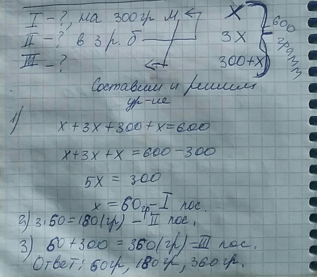 ПО почте отправили 3 посылки весом 600 грамм.Первая на 300 грамм меньше третьей и в 3 раза меньше второй . Найти вес каждой посылки