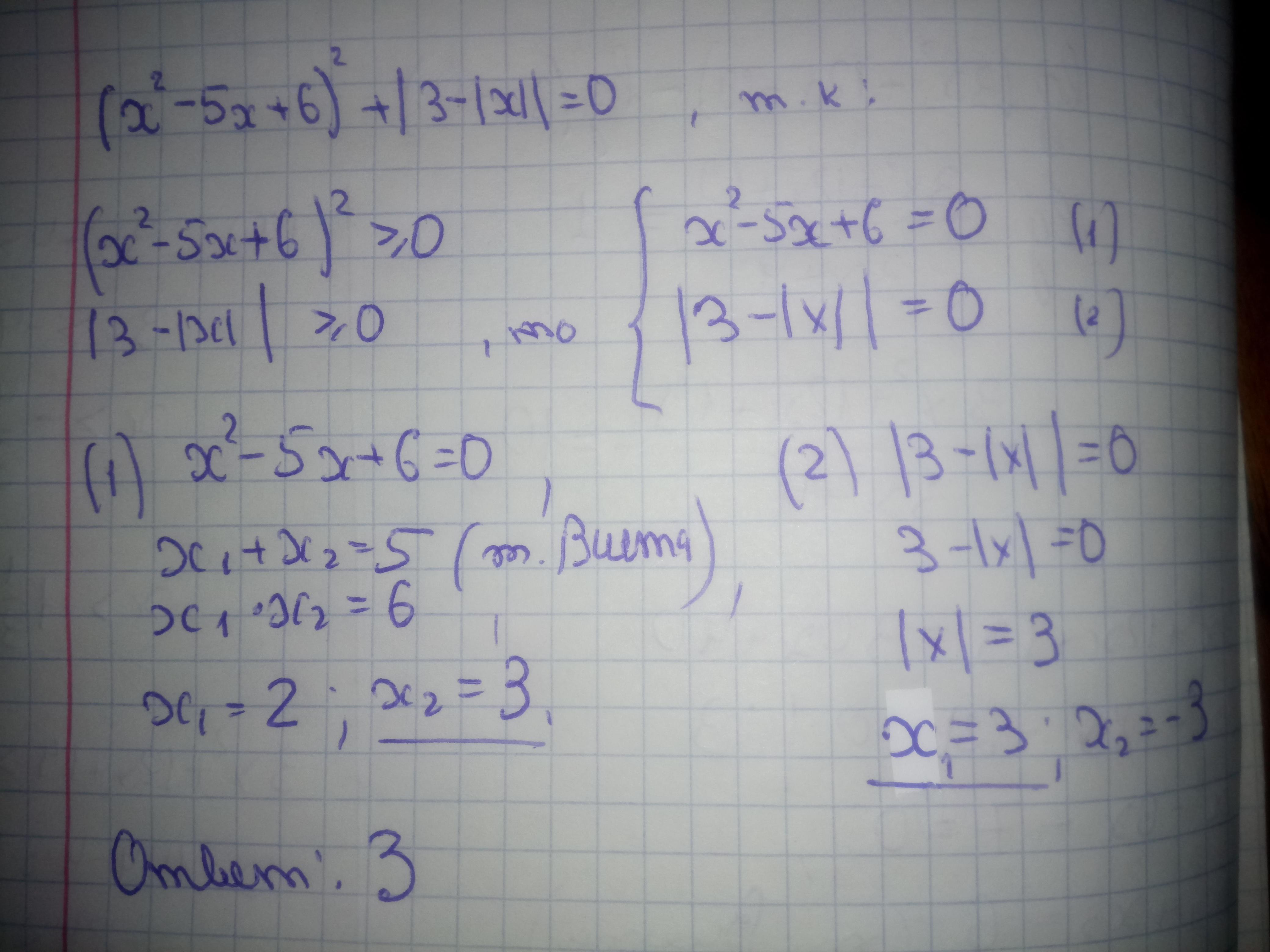 (x^2-5x+6)^2≥0 и |3 -|x||≥0⇒равенство будет выполняться