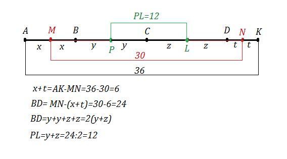 Відрізок довжиною 36 см розділено трьома довільними точками на чотири частини. Відстань між серединами крайніх частин дорівнює 30см знайдіть відстань між серединами середніх частин.