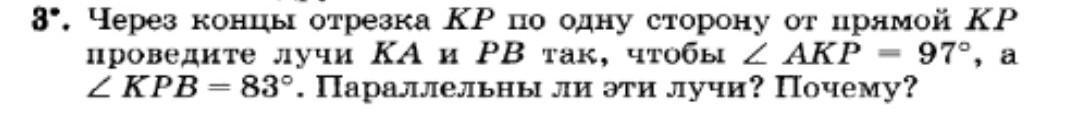 сумма углов КРВ и АКР = 97 + 83=180 Если сумма внутренних односторонних углов равна 180°, то прямые параллельны. следовательно лучи ак и вр параллельны чтд
